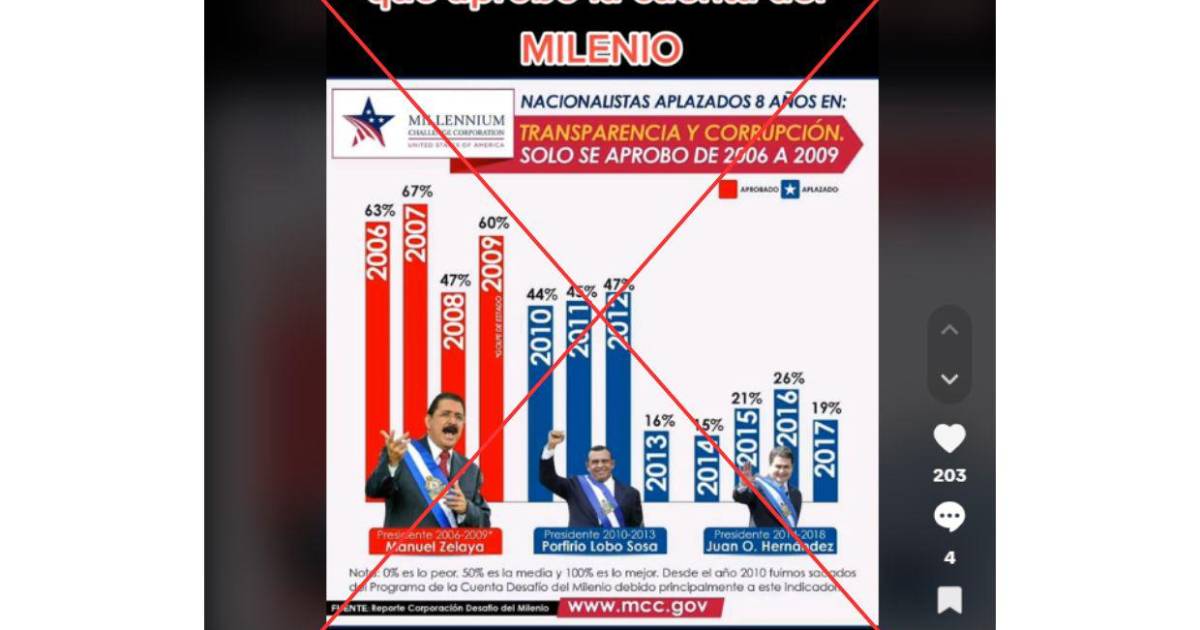 Pero el falso. El gobierno de Manuel Zelaya no aprobó los indicadores para acceder a los fondos de la Cuenta de Milenio, en realidad, cuando recibió los fondos fue por la gestión del gobierno anterior, es decir, la del expresidente (2002-2006) Ricardo Maduro.