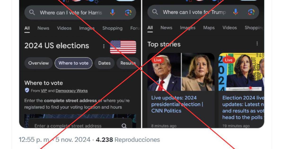Diversas cuentas en redes sociales como Facebook o X/Twitter han difundido una grabación en la que se observa dos búsquedas en Google con las frases en inglés: “Dónde puedo votar por Harris” y “Dónde puedo votar por Trump”.