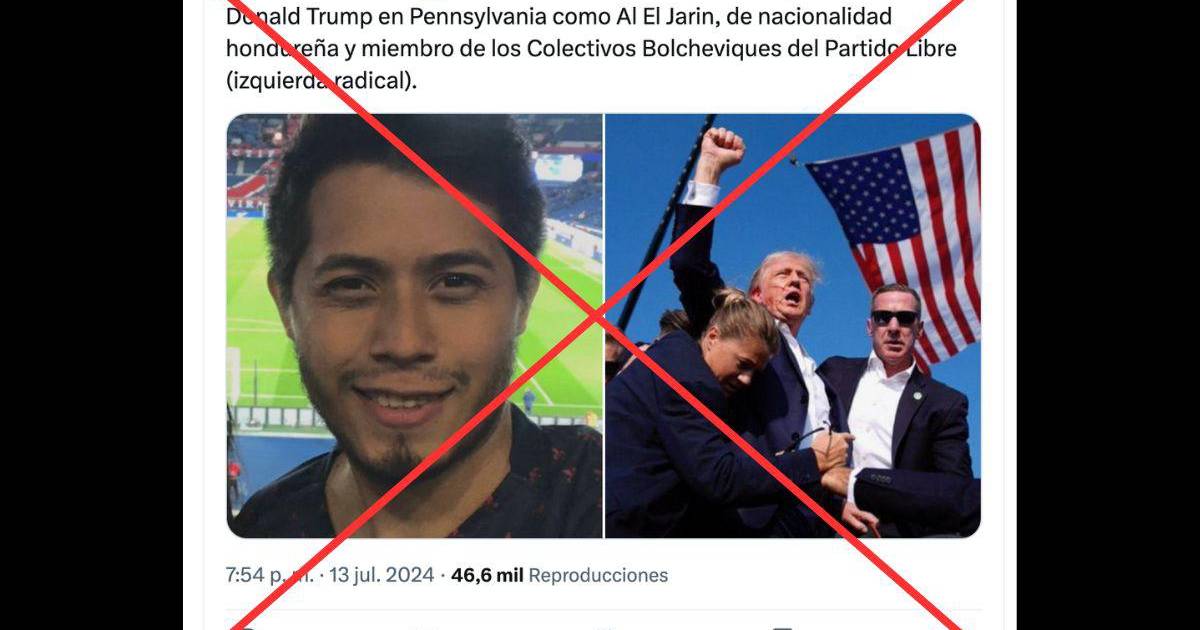 “El FBI ha identificado al tirador que atentó contra Donald Trump, en Pensilvania, como Al El Jarin, de nacionalidad hondureña y miembro de los colectivos Bolcheviques del partido Libre”, dice una publicación en X/Twitter, reproducida más de 46,500 veces desde el 13 de julio de 2024.